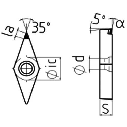 | ISO Code | ANSI Code | Tips | Edge Length | Hole Diameter | Thickness | Rake | Nose Radius | Tip Length |
